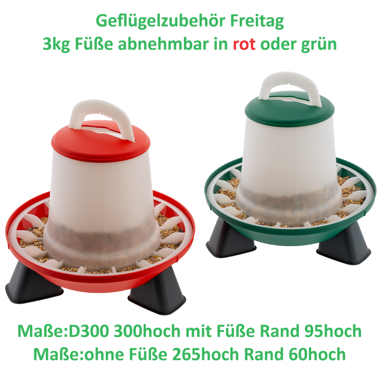 Dieser neue Futterspender ist immer mit Füße erhältlich. Die Füße helfen, das Futter sauber zu halten, indem sie eine Verschmutzung durch Einstreu oder Schmutz reduzieren.Sie können aber die Füße je nach Bedarf aber auch abmachen.